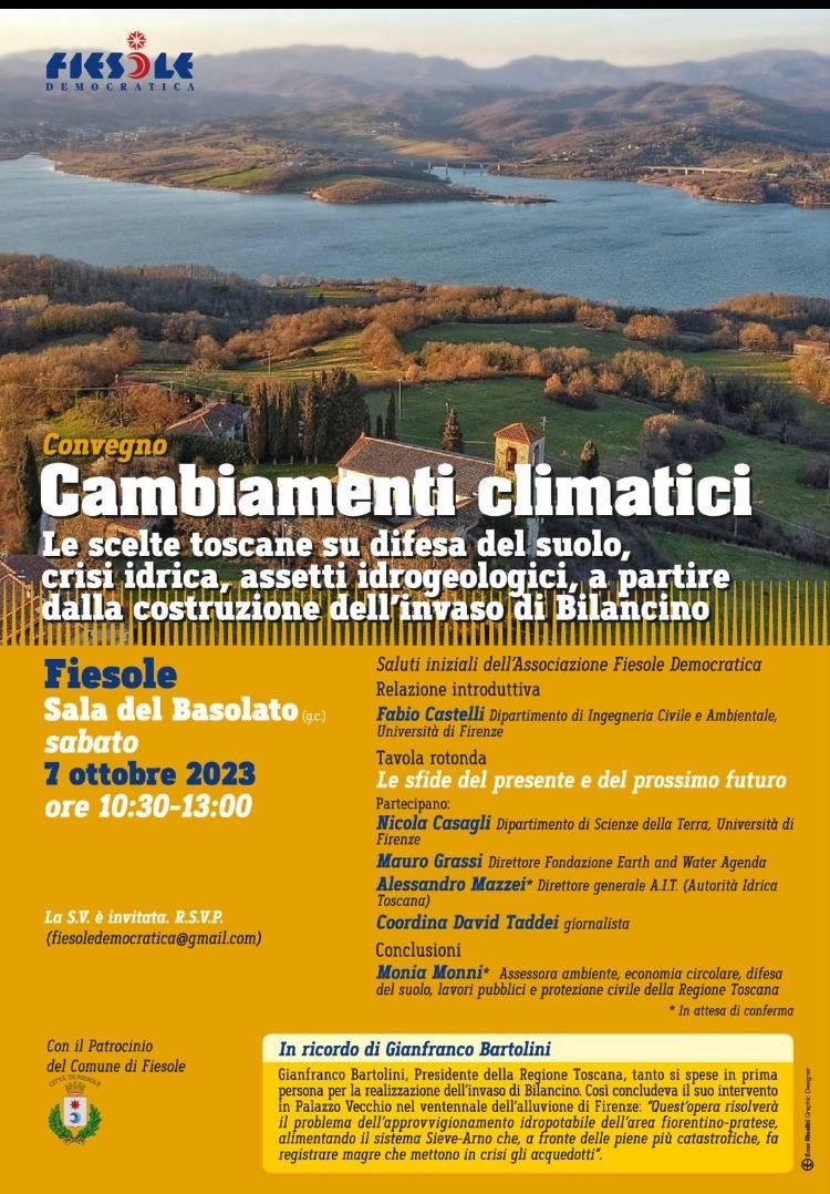 Il giorno sabato 7 ottobre 2023 si terrà a Fiesole (Fi) nella Sala del Basolato il convegno dal titolo "Cambiamenti climatici: le scelte toscane su difesa del suolo, crisi idrica, assetti idrogeologici, a partire dalla costruzione dell'invaso di Bilancino".